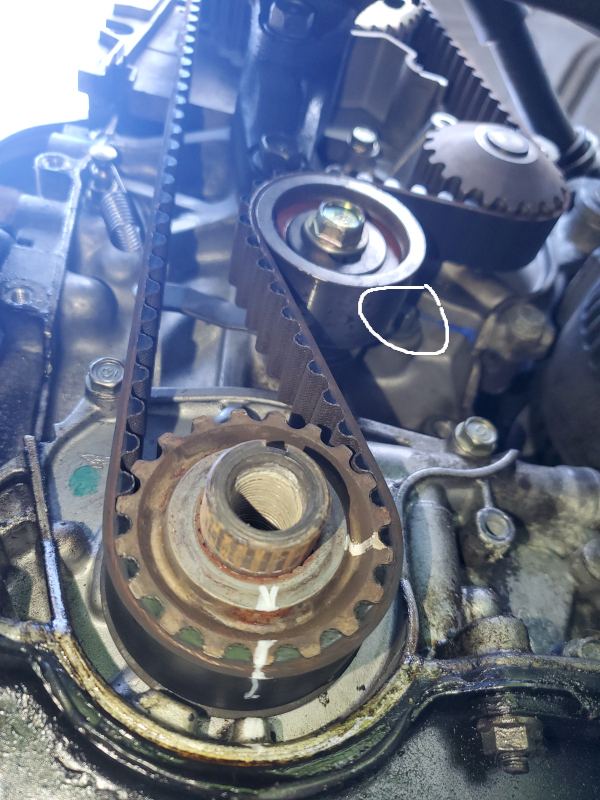 On voit ici le cheminement de la courroie de distribution et, entouré en blanc, le petit goujon sur lequel doit être la tige du tensionneur. On remarque aussi la présence d’un joint d’étanchéité bleu qui a été utilisé pour la pompe à eau par le précédent mécano :