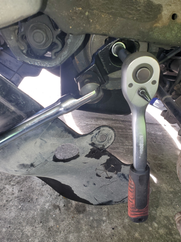 Une fois que la barre est bien calée, on place la clé et ça douille longue sur la vis de poulie et on y met toute sa force. Comme mentionné plus haut, j’ai mis toute la force de ma jambe tout en me tenant à un élément sous la voiture qui permet normalement de la tracter.