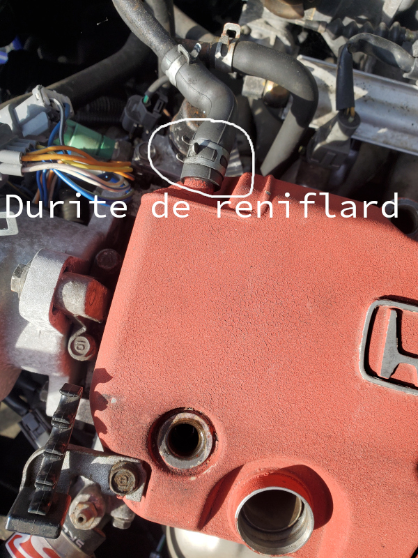 Retirez les fils de bougies et la durite pour les vapeurs de carter (reniflard). Décollez ensuite le cache-culbuteur (de mon point de vue, c’est mieux de le laisser temporairement, surtout si vous bricolez en extérieur… Il vaut mieux éviter que quelque chose tombe dedans).