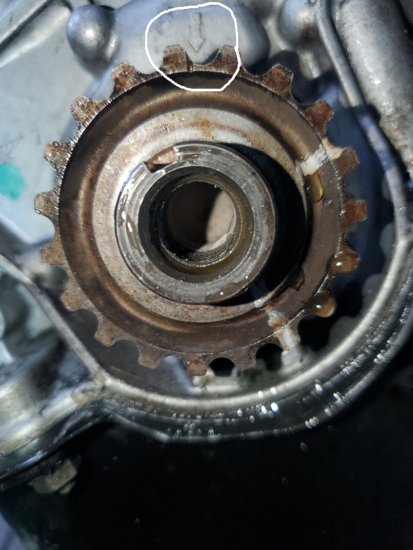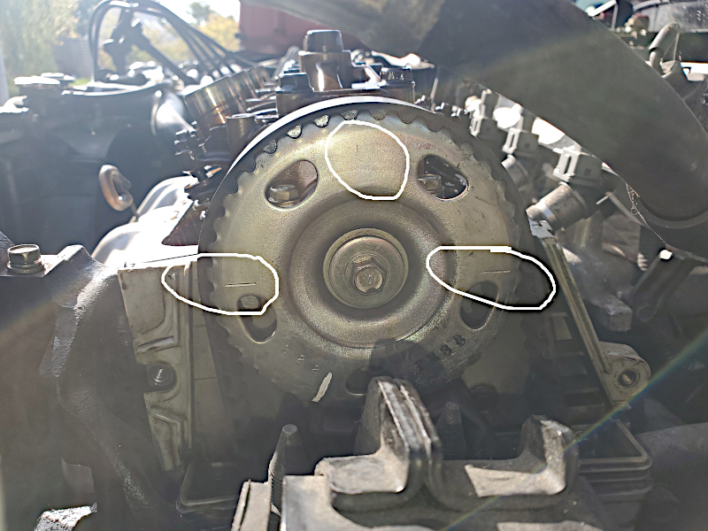 On ne voit pas très bien, mais il est inscrit “UP” en haut de la poulie d’arbre à cames :