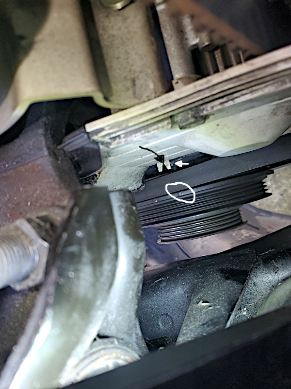 Si à ce stade le vilebrequin est toujours correctement aligné (visible soit avec les repères du cache inférieur, soit avec la petite flèche sur le bloc moteur et la dent de la petite poulie) alors c’est bon.